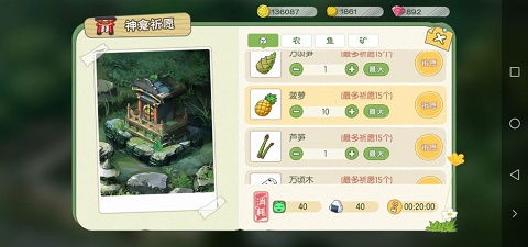 祈愿有四神,可以分别获得鱼类,农产品,木产资源和野外资源,矿产资源。